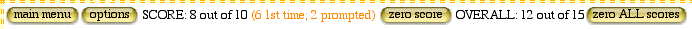 | Getting started You can start up MouseTrial by simply clicking on one of the modules if you're playing online. If you're playing MouseTrial locally on your home computer (having downloaded it) then you'll need to run the file mousetrial.html. MouseTrial is always played using your web browser (usually Internet Explorer). If Internet Explorer is your default browser then you can simply double click on mousetrial.html. Alternatively you can drag mousetrial.html and drop it on the Internet Explorer icon, or you can start it using the "File>Open With..." option from the menu. Once started, you'll see the choice of submodules available. If you like you can then add the page to your browser's list of favourites so that it's really quick to get back to it next time. supervised or unsupervised? To begin with you'll probably want to sit with your child as they use MouseTrial. If they're not familiar with using a mouse then you can prompt them with your hand over theirs until they get the hang of it. As your child becomes more confident you can sit back a little and provide less intervention. If your child gets really proficient with MouseTrial you may find that you can leave them to get on with it. You can use the scoreline afterwards to keep track of how many trials they have done. let them win! MouseTrial will work best if your child is getting the right answer most of the time. That way they'll become confident and won't be put off when they do make the occasional mistake. Try to make sure that they're getting the right answer about 90% of the time or more. If necessary you can make it easier by leaving out some of the more difficult items or by having fewer items in the array (see below). make changes with the options page It's very easy to adjust mousetrial using the options page. The options page for the "numerals" game in the numbers module is shown above. You can use the tick boxes next to each individual item to control whether or not it can appear in the array. For example, if you only wanted to do trials on the digits 1-9 with your child then you could simply un-check the boxes next to the 0, 10, 11, and 12 images. You can also set the array size on the options page. Just type the number you want into the array size box. It's usually best to start off with a small array and then increase it later to make the trials harder and more interesting. pictures? words? or both? | By default MouseTrial will display an array of pictures to choose from, but you can also opt to display the corresponding word underneath as well. This can be a good way of helping the child to recognise words. It's also possible to use an array of words only. This will test whether the child can identify the word without needing a pictorial clue. | what if they get "click happy"? When you first play MouseTrial you'll discover that if you click on the wrong item then the right one will flash to give you a hint. This is useful for teaching new vocabulary. But sometimes, a child will learn that you can use this mechanism as a shortcut to finding the right item! You'll know when this is happening because the child will click on any old item at random, and then hit the flashing item with 100% reliability. This isn't something to worry about. It means that your child has independently invented a way to get the computer to do what he wants! This is a skill that will serve him very well as he gets older. It does get in the way of learning vocabulary however, so we need to do something about it. The number of retries parameter is provided to control this situation. The number of retries is set to zero by default, but if you raise it to 1 retry then MouseTrial won't immediately flash the right item in response to a wrong click. Instead, it will just repeat the question. The flashing will only commence if the child clicks the wrong thing a second time. So it'll be slightly harder work for the child to get the hint, and hopefully they'll resort to trying to hit the correct thing in the first place. You can further increase the number of retries to 2 or 3 if necessary. This will usually be effective, especially when you make the trial slightly easier at the same time (by making the array smaller or by eliminating some of the more difficult items). the score line This is the scoreline that appears just above the array of images when playing MouseTrial. In this case you can see that the child has made 8 correct hits out of a total of 10 while playing this particular submodule. This is displayed in the black text on the left just after the "main menu" and "options" buttons. Immediately to the right of that there's some text in brackets telling us that of the 8 correct hits 6 were hit on the first attempt and 2 were hit only after a yellow flashing prompt. You can reset the scores for this submodule to zero by clicking the "zero score" button which appears just to the right of this. The next portion of black text appearing to the right after that shows the scores for MouseTrial as a whole (including all submodules of all modules that you have been playing). You can can reset all of the scores at once using the "zero ALL scores" button at the far right. different users, online and off If you log in to your computer under a different user name you'll find that you have a completely separate set of scores and options. So you can tailor MouseTrial individually for several different children. You may also have to enter your MouseTrial license key separately for each user the first time you log in (but don't worry, the same license key will work for all. You don't have to purchase more license keys unless you're using MouseTrial on several computers at the same time). Similarly if you sometimes play here online and sometimes offline on a copy stored locally on your computer, then most browsers will keep separate independent scores and options settings for online vs offline. |